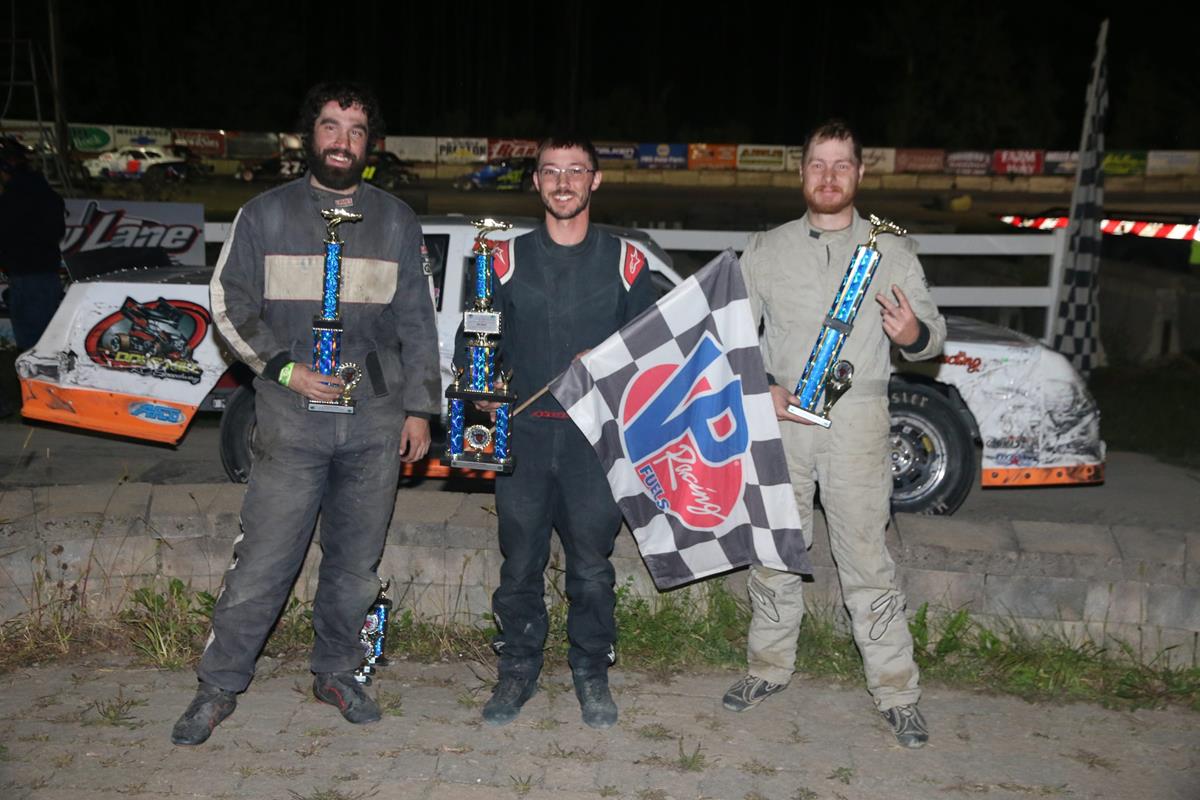 In the LaValley Building Supply Dirt Stocks rookie Tyler Fellows is un-fire claiming his third win of the season. Fellows beat out Aren Keene who found himself one spot short of a triple crown, Tyler Tremblay back in the saddle comes home in third. Keith Mansur and Ryan Christian completed the top five. For the makeup event from Federated Auto Parts night Keith Mansur gets the win.